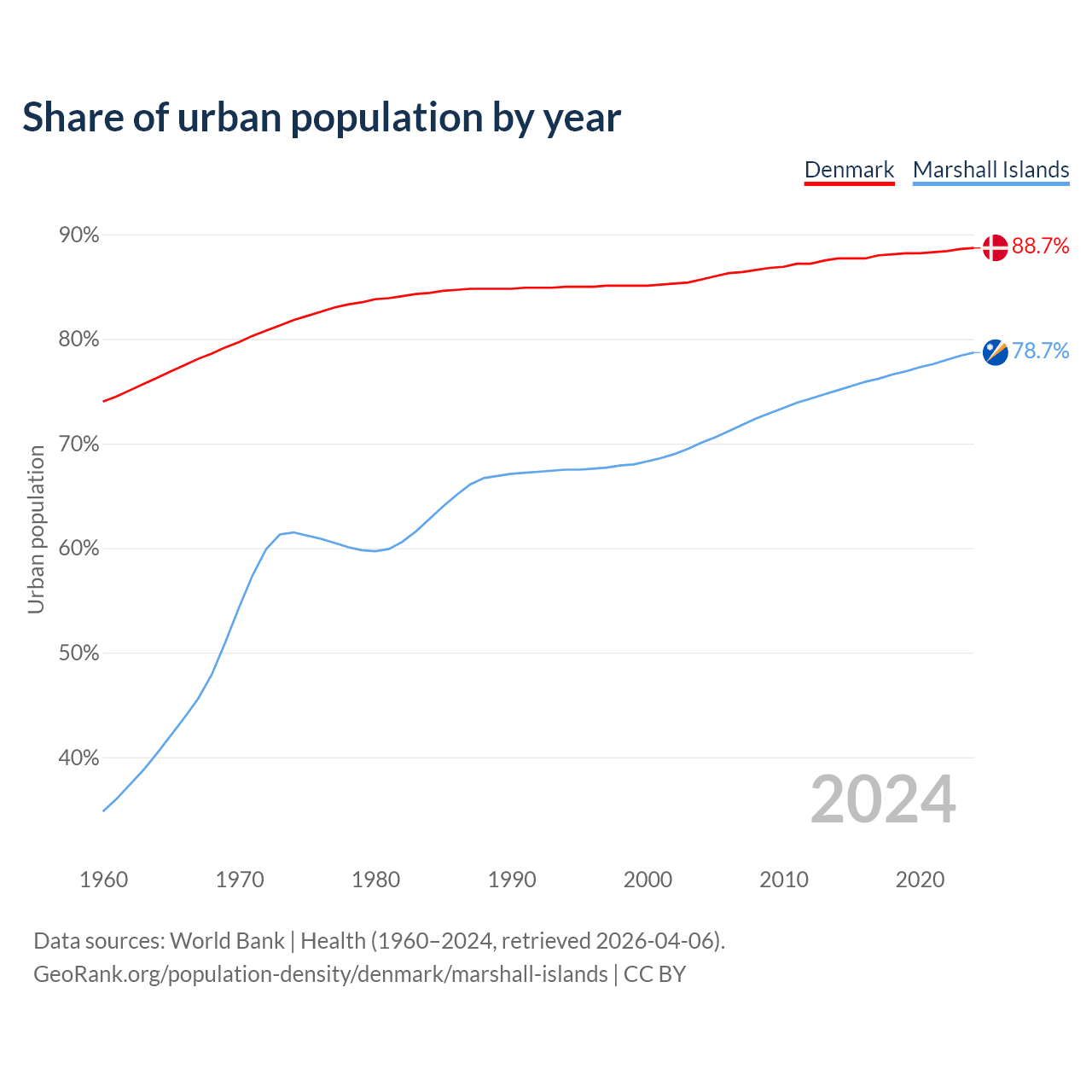 From 2004 to 2024, the share of urban population changed from 85.7% to 88.7% in Denmark and from 70.1% to 78.7% in the Marshall Islands.