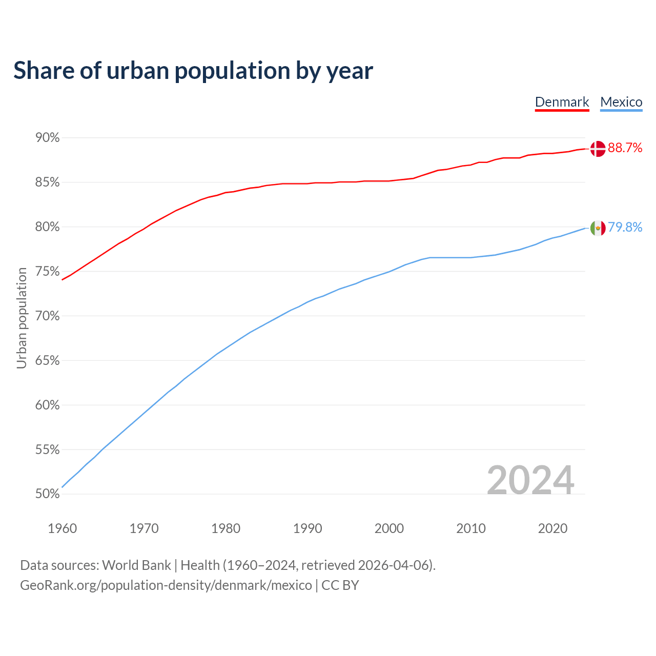 From 2004 to 2024, the share of urban population changed from 85.7% to 88.7% in Denmark and from 76.3% to 79.8% in Mexico.