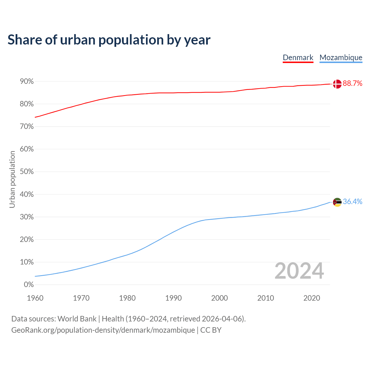 From 2004 to 2024, the share of urban population changed from 85.7% to 88.7% in Denmark and from 29.9% to 36.4% in Mozambique.