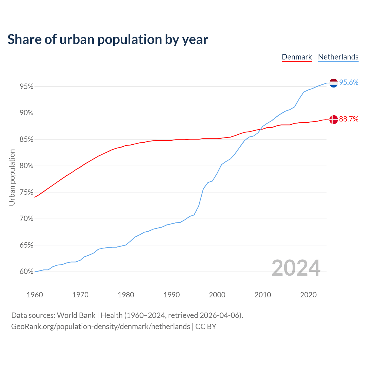 From 2004 to 2024, the share of urban population changed from 85.7% to 88.7% in Denmark and from 82.3% to 95.6% in the Netherlands.