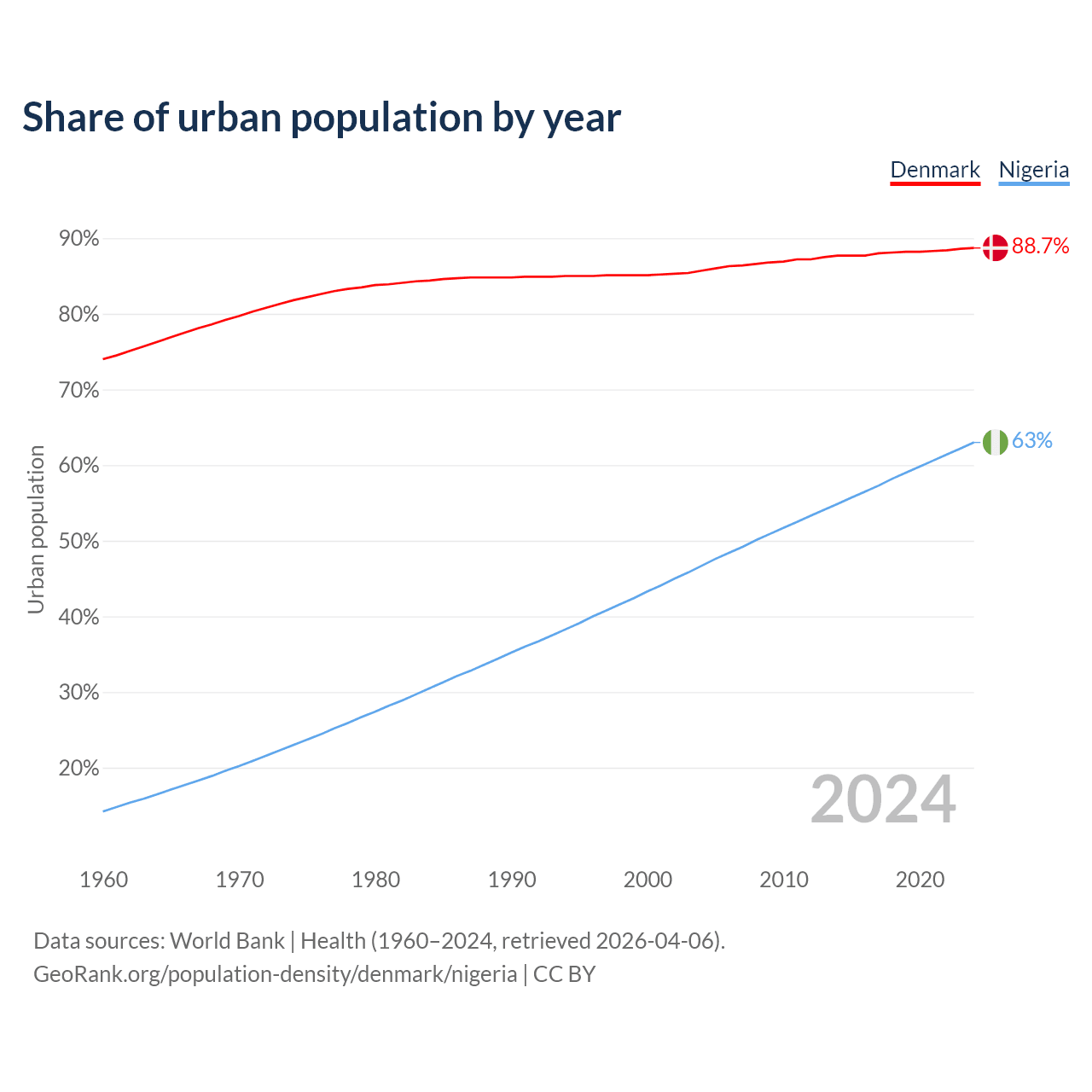 From 2004 to 2024, the share of urban population changed from 85.7% to 88.7% in Denmark and from 46.7% to 63% in Nigeria.
