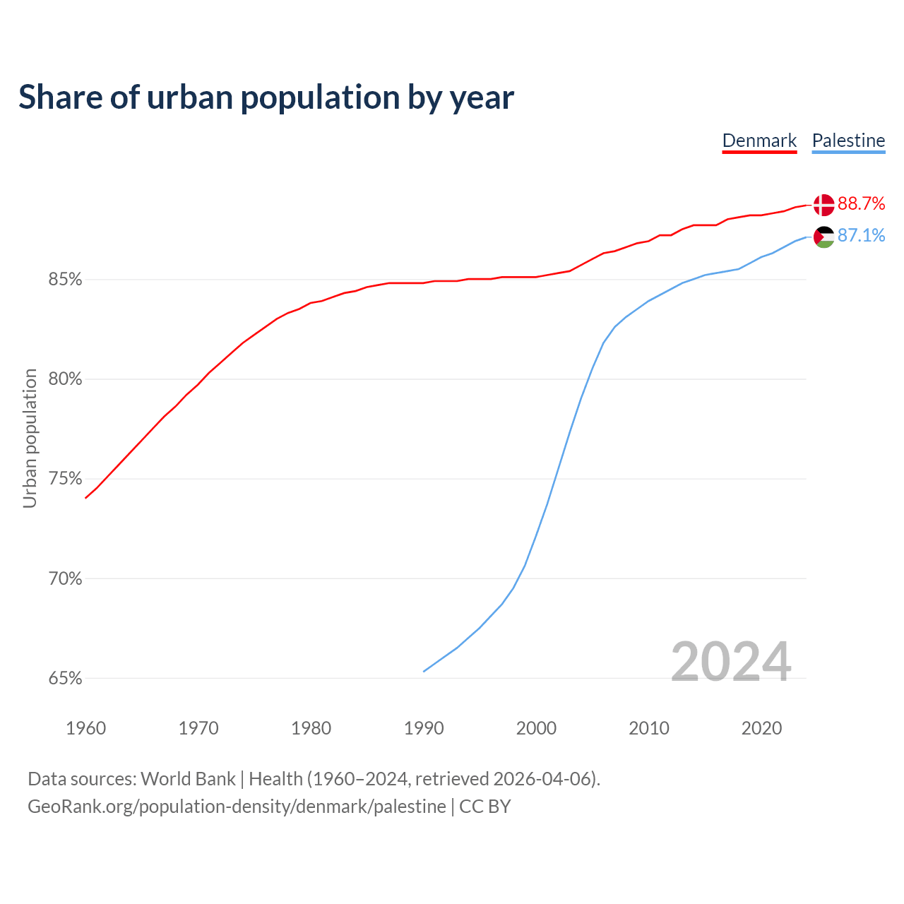 From 2004 to 2024, the share of urban population changed from 85.7% to 88.7% in Denmark and from 79% to 87.1% in Palestine.
