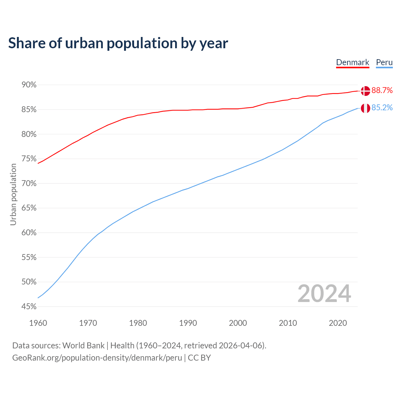 From 2004 to 2024, the share of urban population changed from 85.7% to 88.7% in Denmark and from 74.4% to 85.2% in Peru.