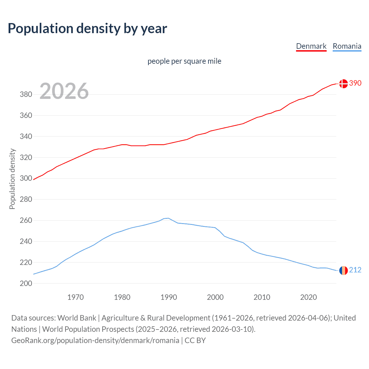 From 2006 to 2026, population density in Denmark increased by 10.9%, compared to a 11.1% decline in Romania.