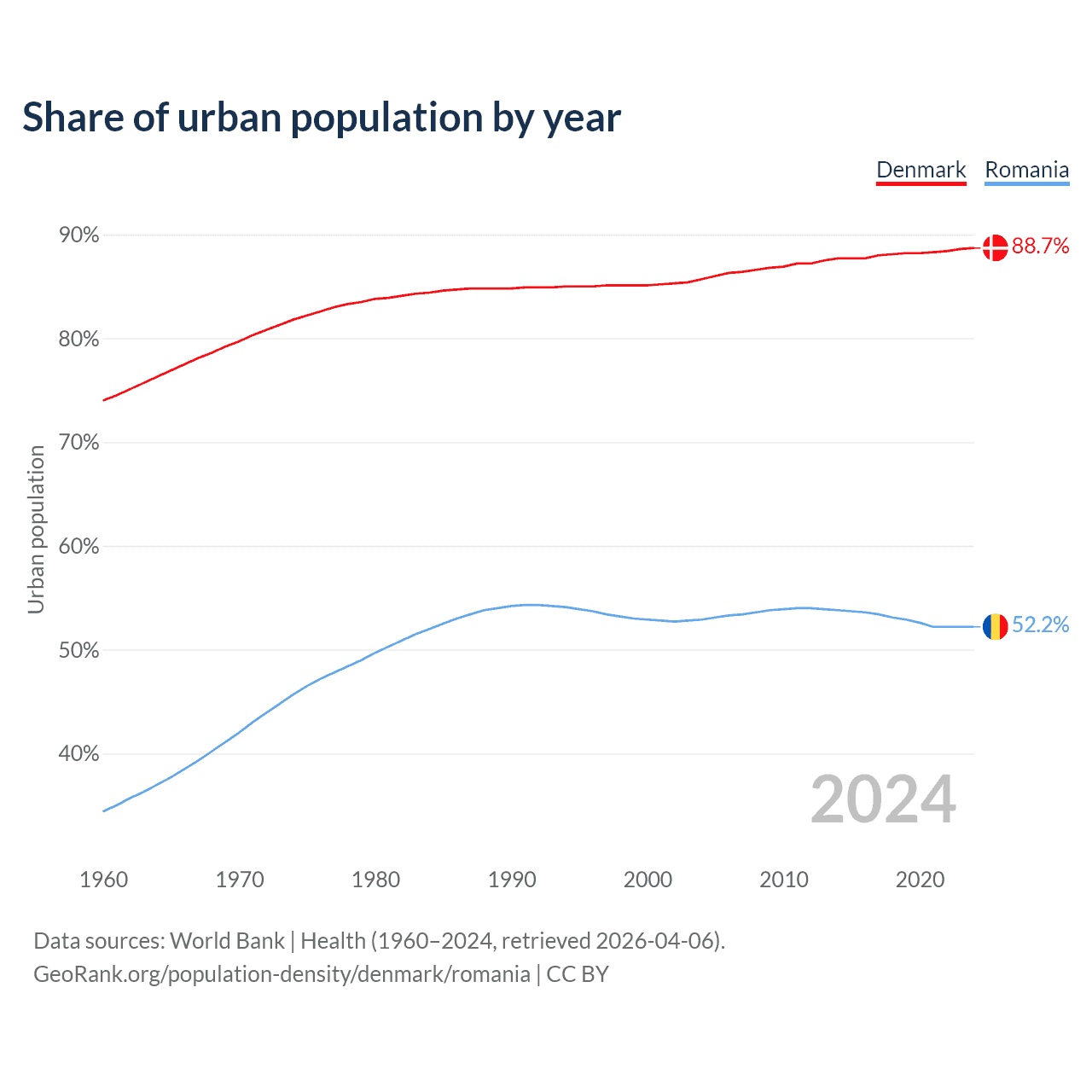From 2004 to 2024, the share of urban population changed from 85.7% to 88.7% in Denmark and from 52.9% to 52.2% in Romania.