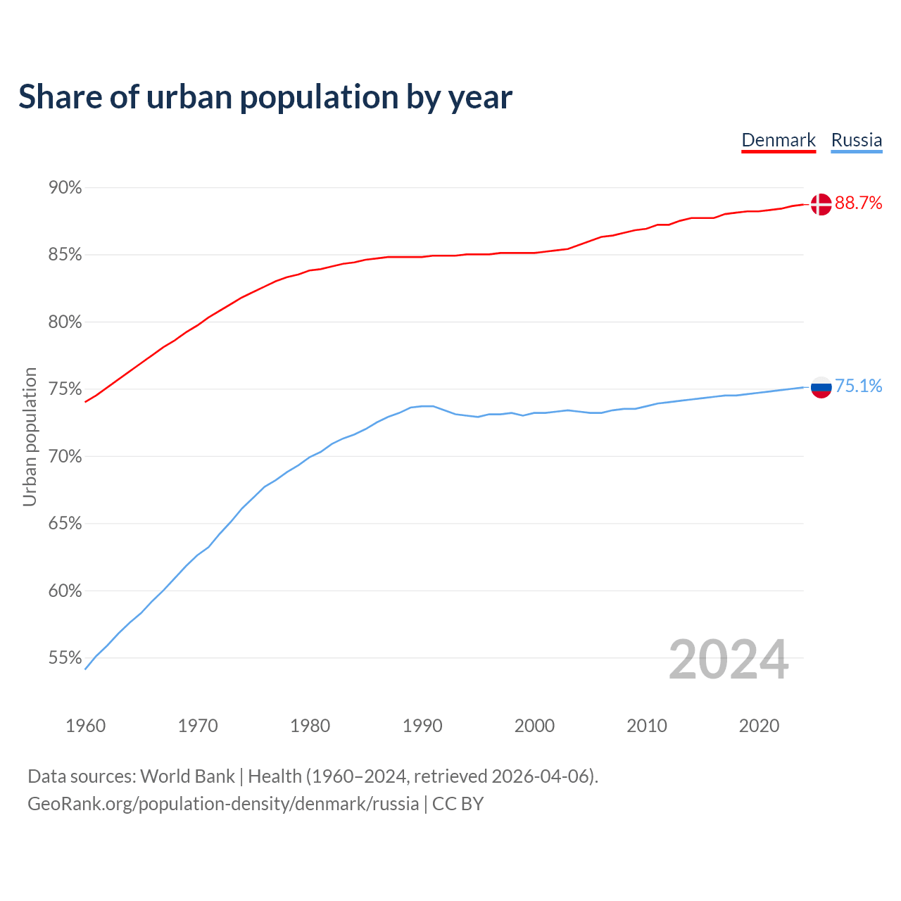 From 2004 to 2024, the share of urban population changed from 85.7% to 88.7% in Denmark and from 73.3% to 75.1% in Russia.