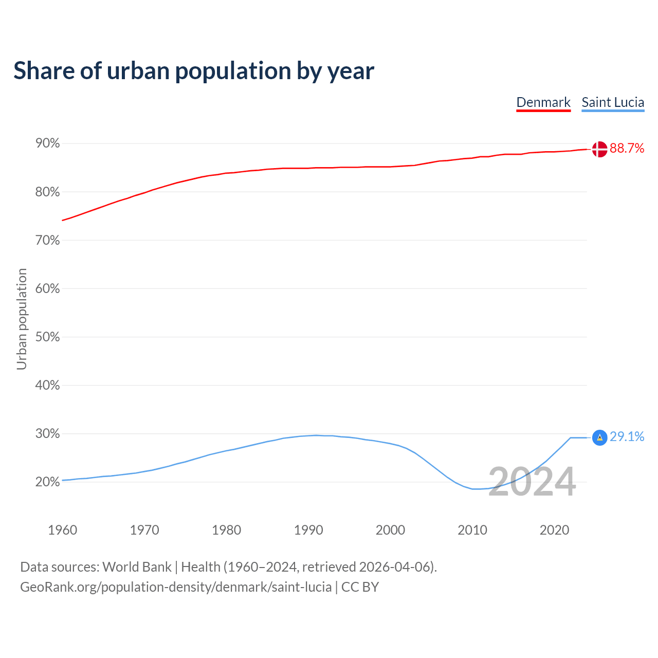 From 2004 to 2024, the share of urban population changed from 85.7% to 88.7% in Denmark and from 24.8% to 29.1% in Saint Lucia.