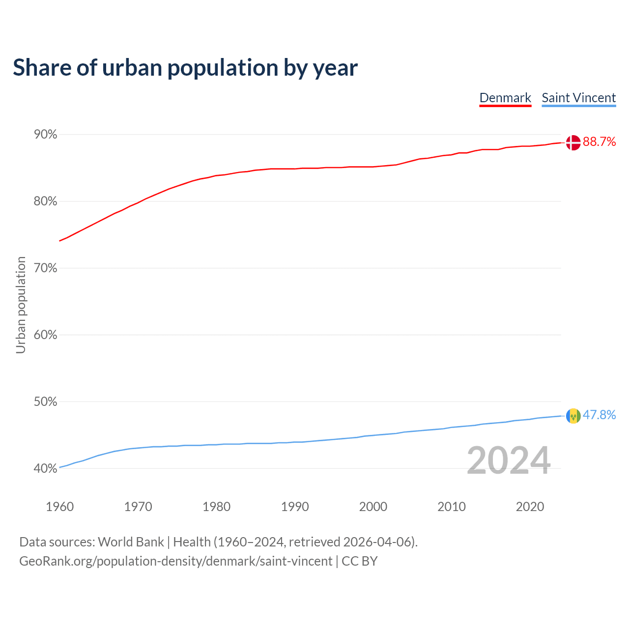 From 2004 to 2024, the share of urban population changed from 85.7% to 88.7% in Denmark and from 45.4% to 47.8% in Saint Vincent.