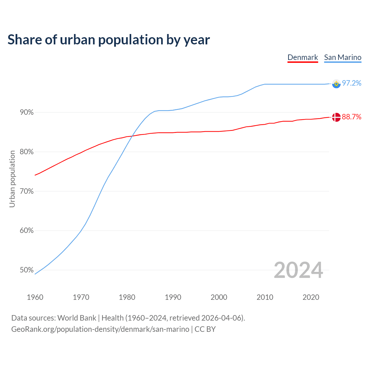 From 2004 to 2024, the share of urban population changed from 85.7% to 88.7% in Denmark and from 94.2% to 97.2% in San Marino.