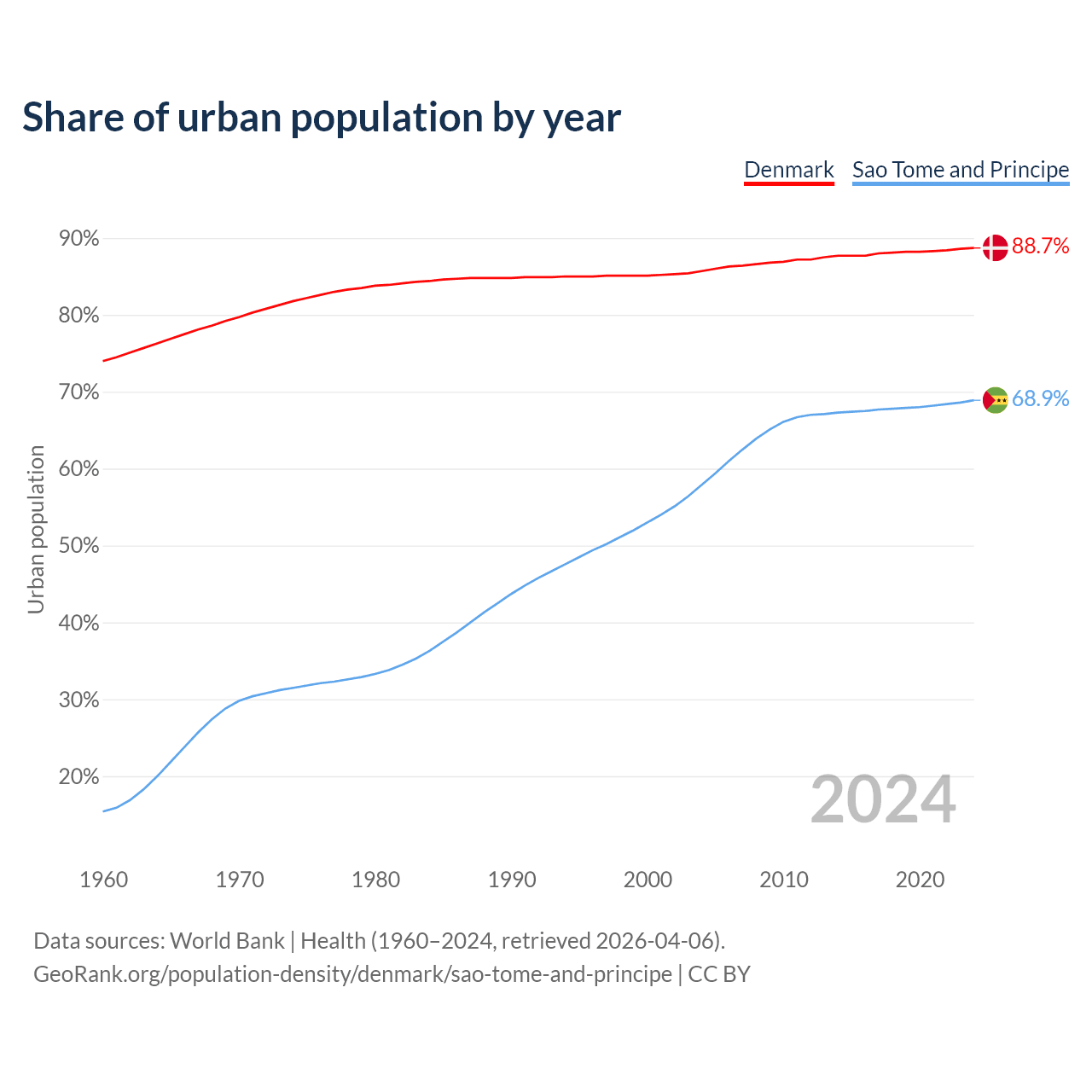 From 2004 to 2024, the share of urban population changed from 85.7% to 88.7% in Denmark and from 57.9% to 68.9% in Sao Tome and Principe.