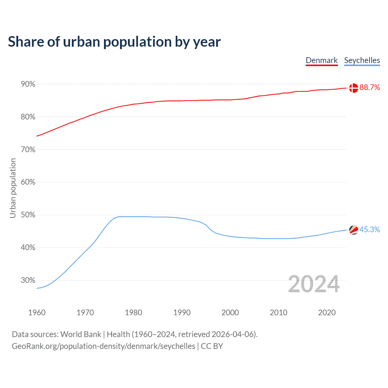 From 2004 to 2024, the share of urban population changed from 85.7% to 88.7% in Denmark and from 42.9% to 45.3% in the Seychelles.
