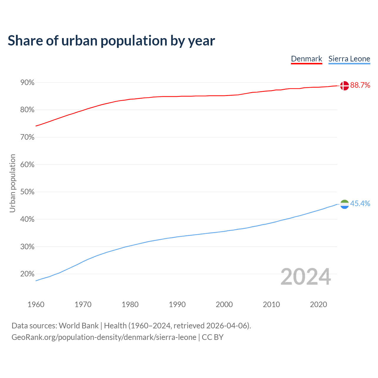 From 2004 to 2024, the share of urban population changed from 85.7% to 88.7% in Denmark and from 36.5% to 45.4% in Sierra Leone.