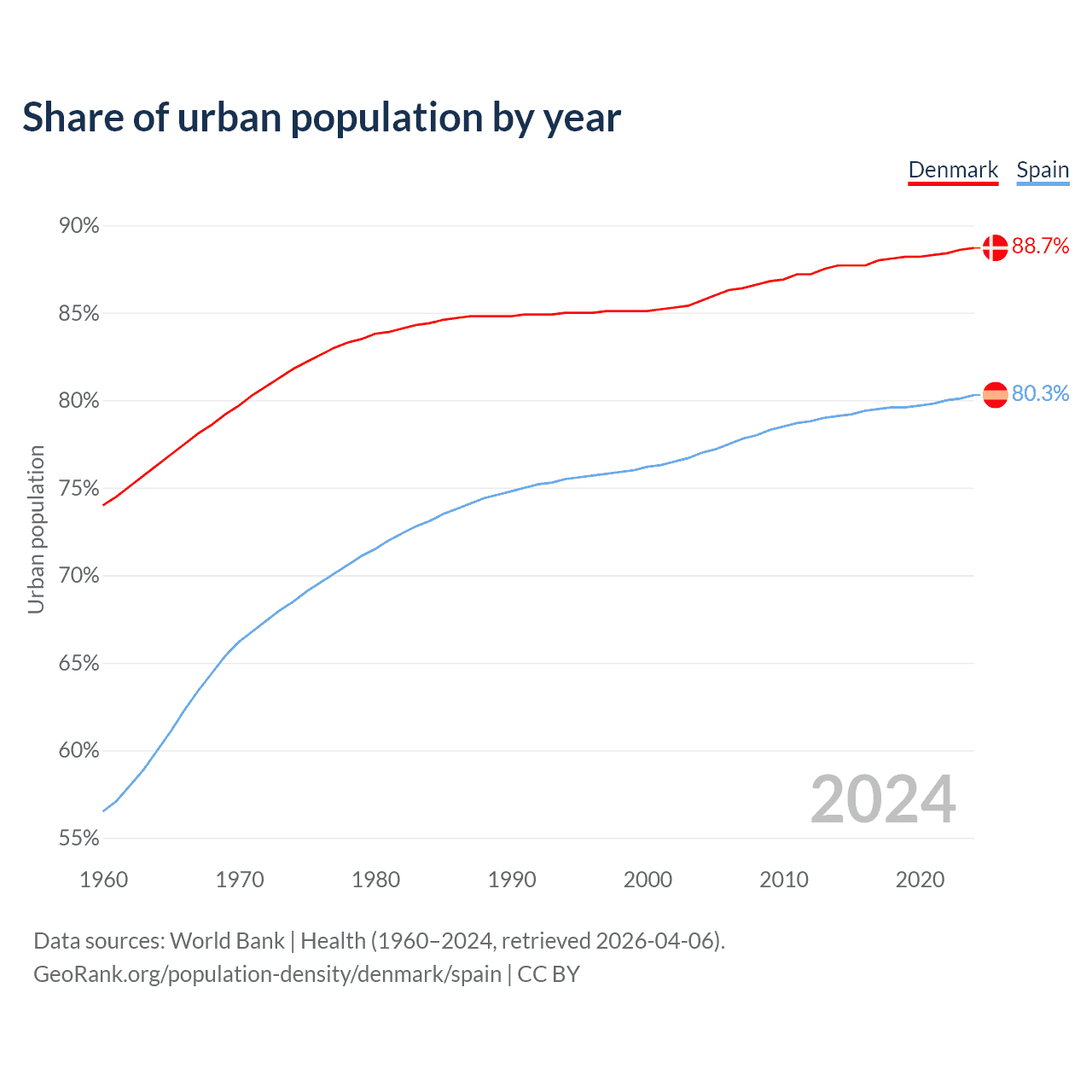From 2004 to 2024, the share of urban population changed from 85.7% to 88.7% in Denmark and from 77% to 80.3% in Spain.