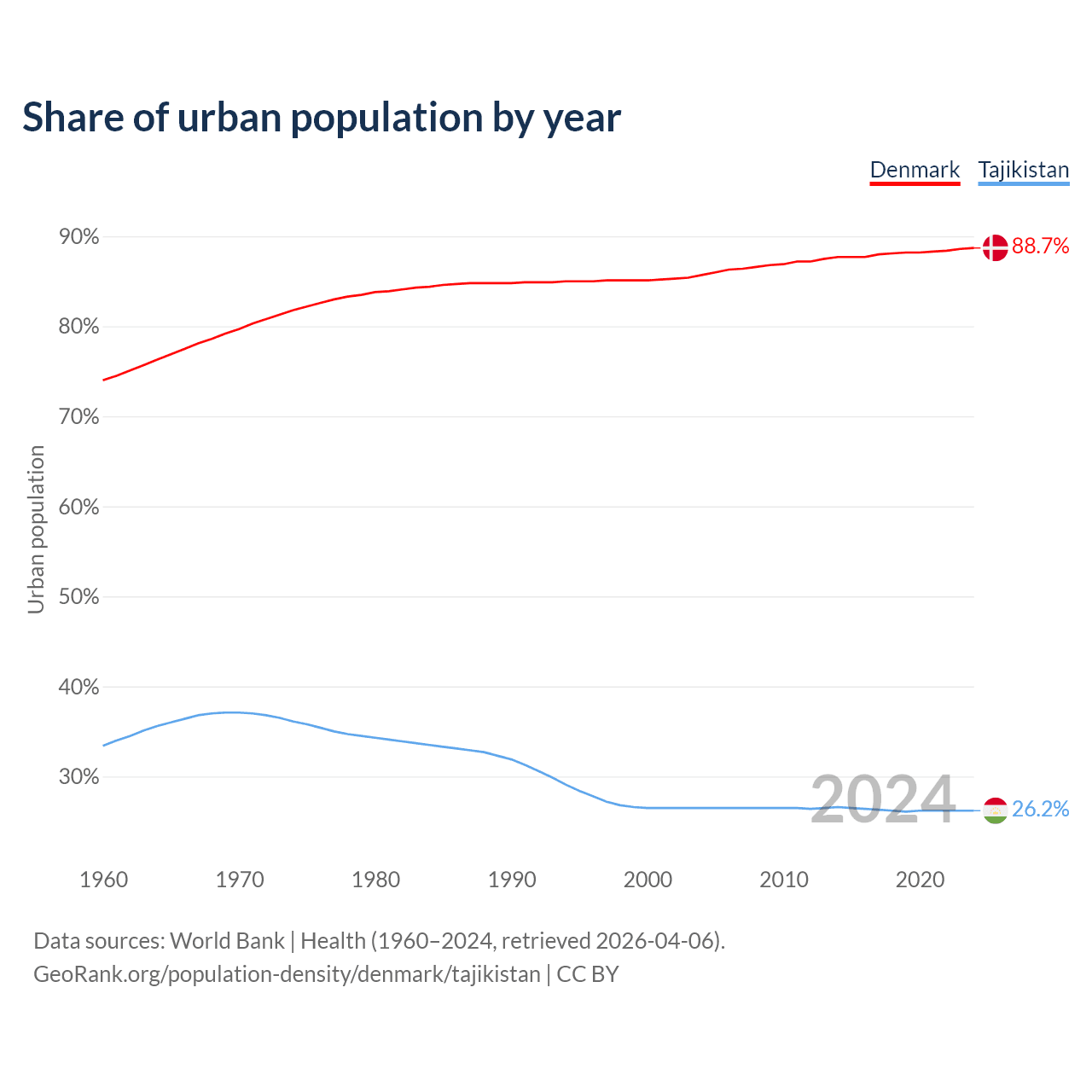 From 2004 to 2024, the share of urban population changed from 85.7% to 88.7% in Denmark and from 26.5% to 26.2% in Tajikistan.