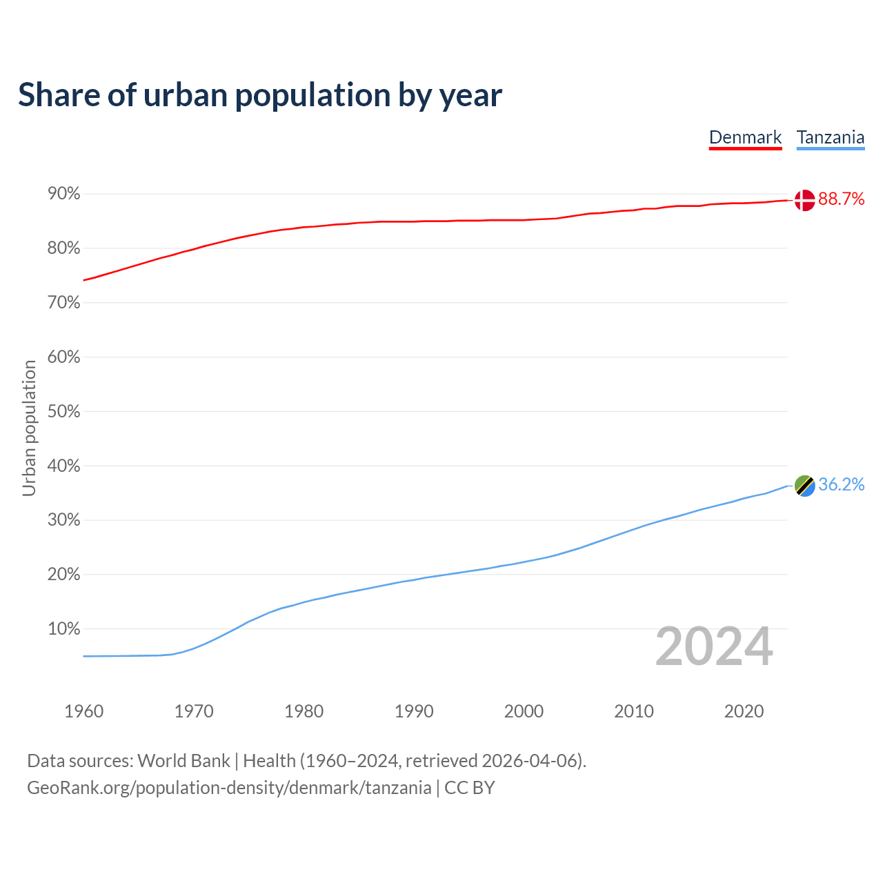 From 2004 to 2024, the share of urban population changed from 85.7% to 88.7% in Denmark and from 24.1% to 36.2% in Tanzania.
