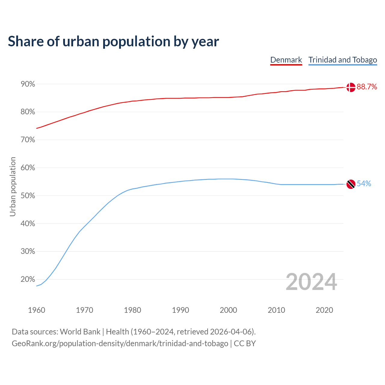 From 2004 to 2024, the share of urban population changed from 85.7% to 88.7% in Denmark and from 55.6% to 54% in Trinidad and Tobago.