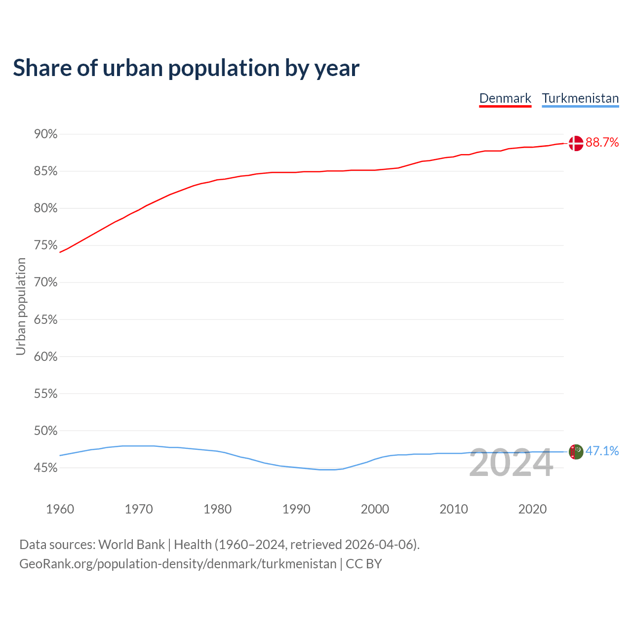 From 2004 to 2024, the share of urban population changed from 85.7% to 88.7% in Denmark and from 46.7% to 47.1% in Turkmenistan.