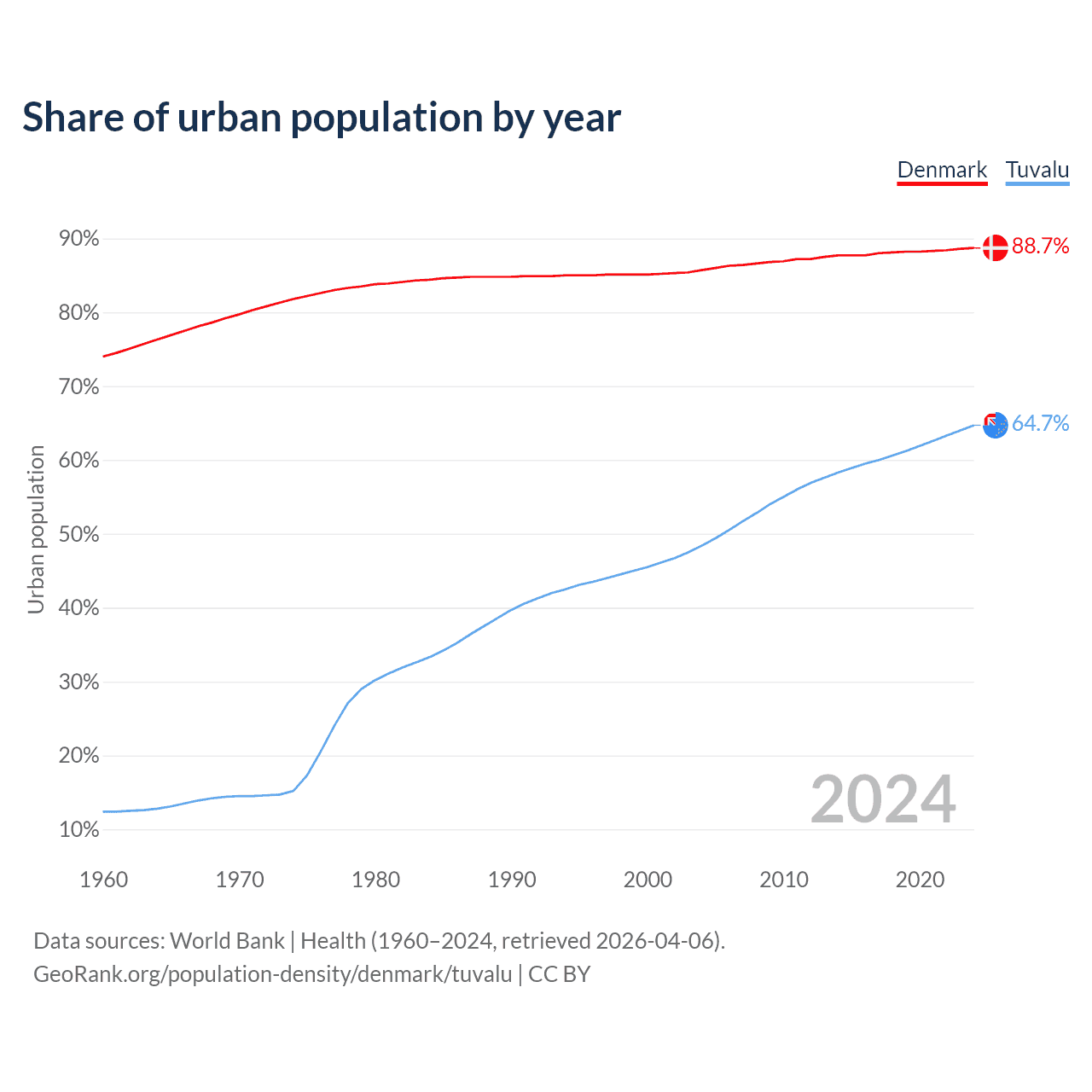 From 2004 to 2024, the share of urban population changed from 85.7% to 88.7% in Denmark and from 48.4% to 64.7% in Tuvalu.