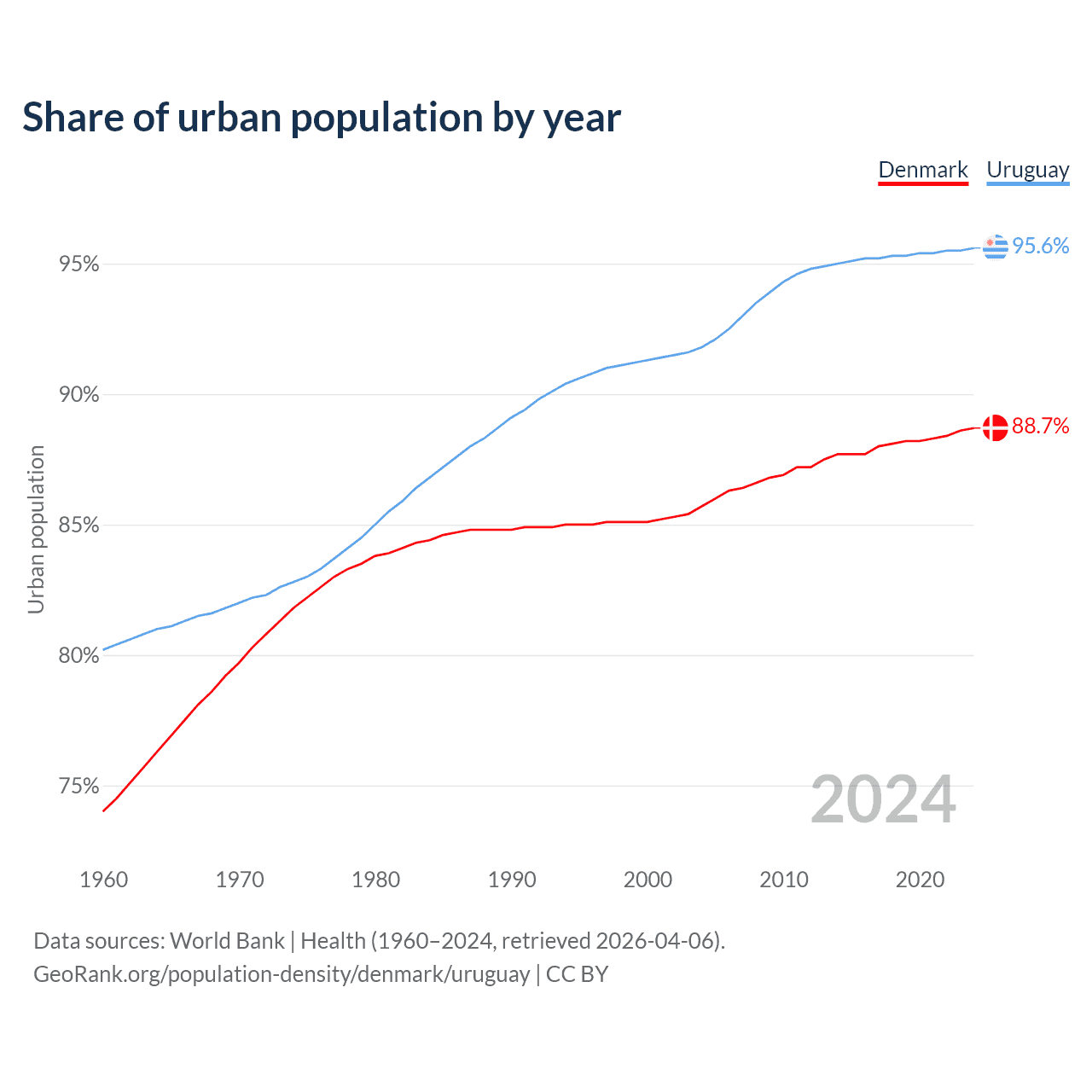From 2004 to 2024, the share of urban population changed from 85.7% to 88.7% in Denmark and from 91.8% to 95.6% in Uruguay.