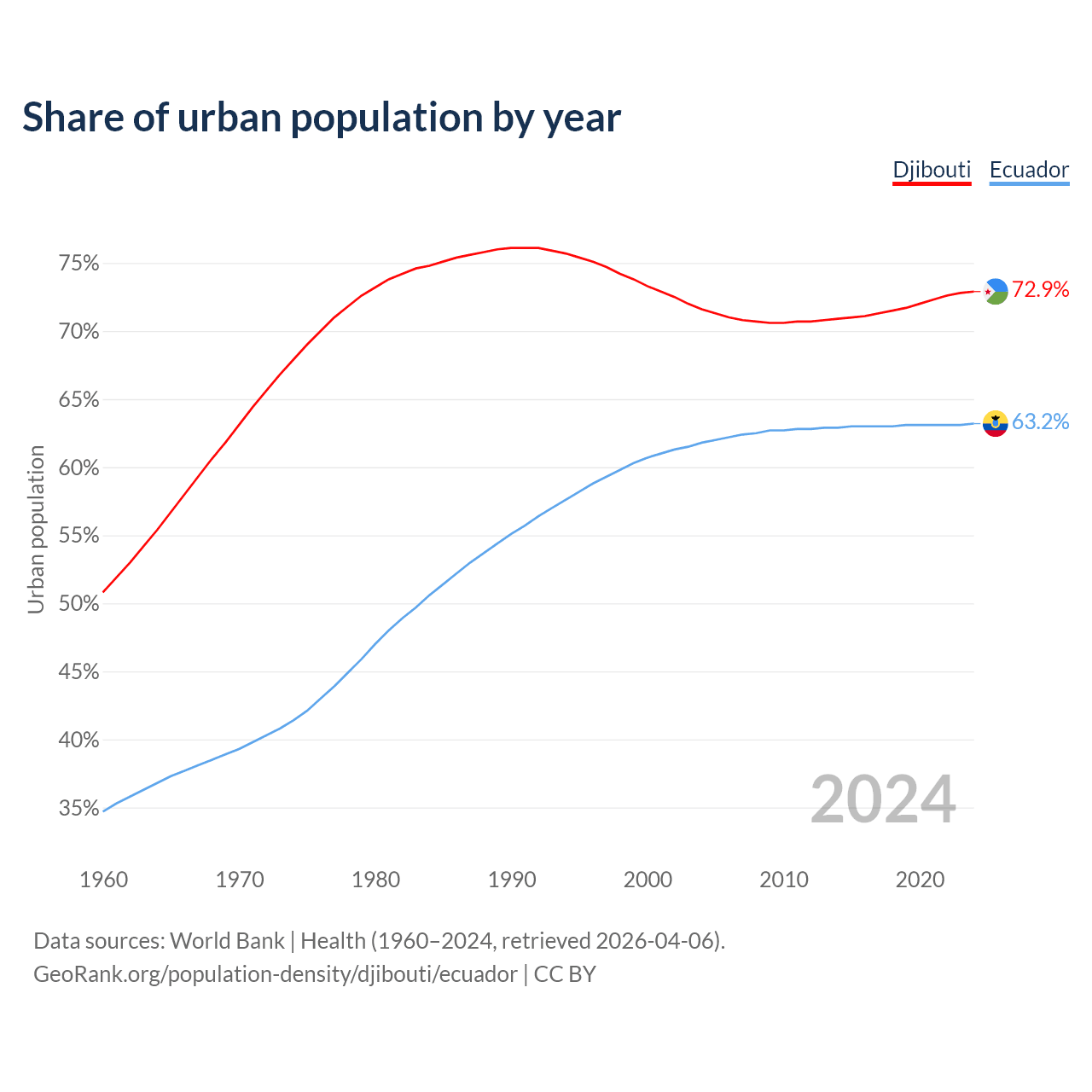 From 2004 to 2024, the share of urban population changed from 71.6% to 72.9% in Djibouti and from 61.8% to 63.2% in Ecuador.