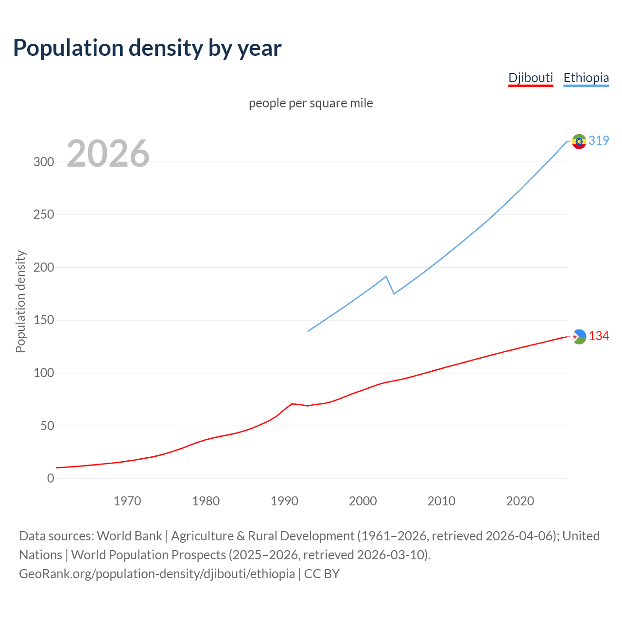 From 2006 to 2026, population density in Djibouti increased by 40.2%, compared to a 72.2% growth in Ethiopia.
