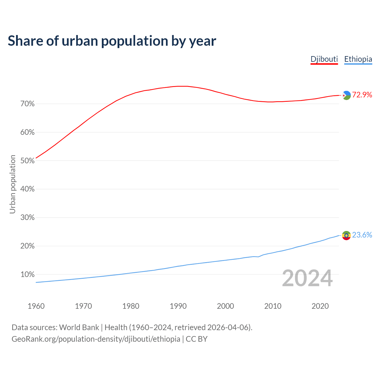 From 2004 to 2024, the share of urban population changed from 71.6% to 72.9% in Djibouti and from 15.8% to 23.6% in Ethiopia.