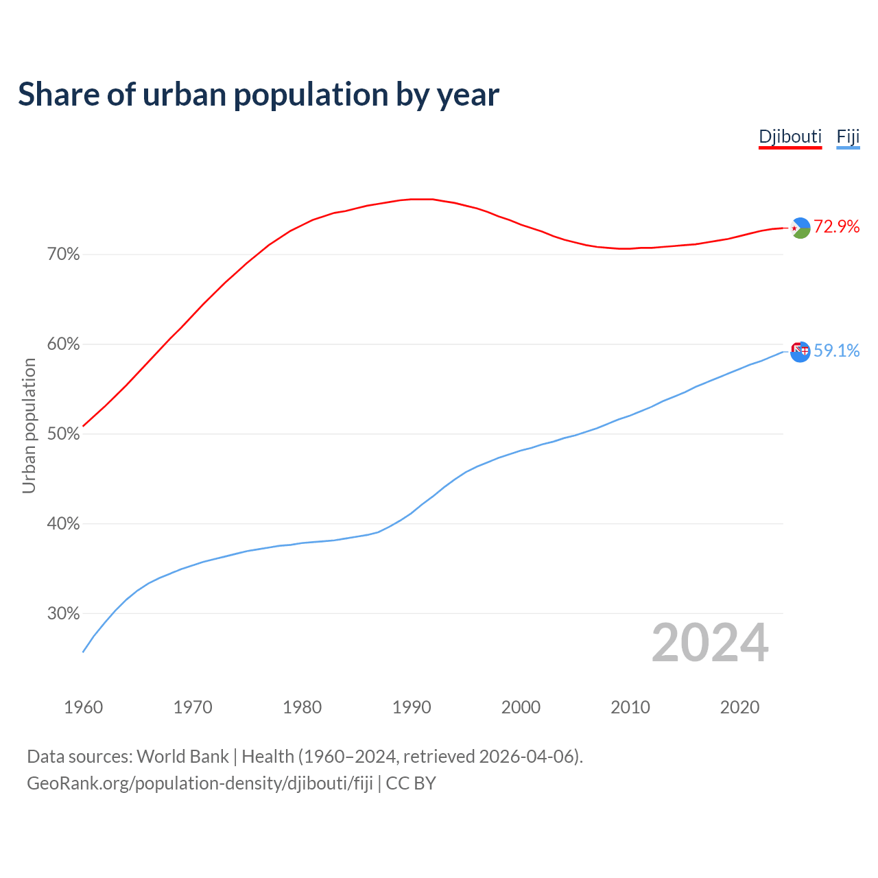 From 2004 to 2024, the share of urban population changed from 71.6% to 72.9% in Djibouti and from 49.5% to 59.1% in Fiji.