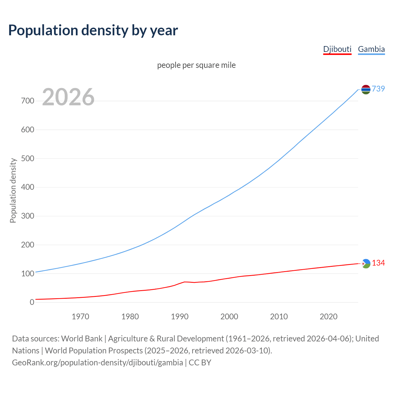 From 2006 to 2026, population density in Djibouti increased by 40.2%, compared to a 68.2% growth in the Gambia.