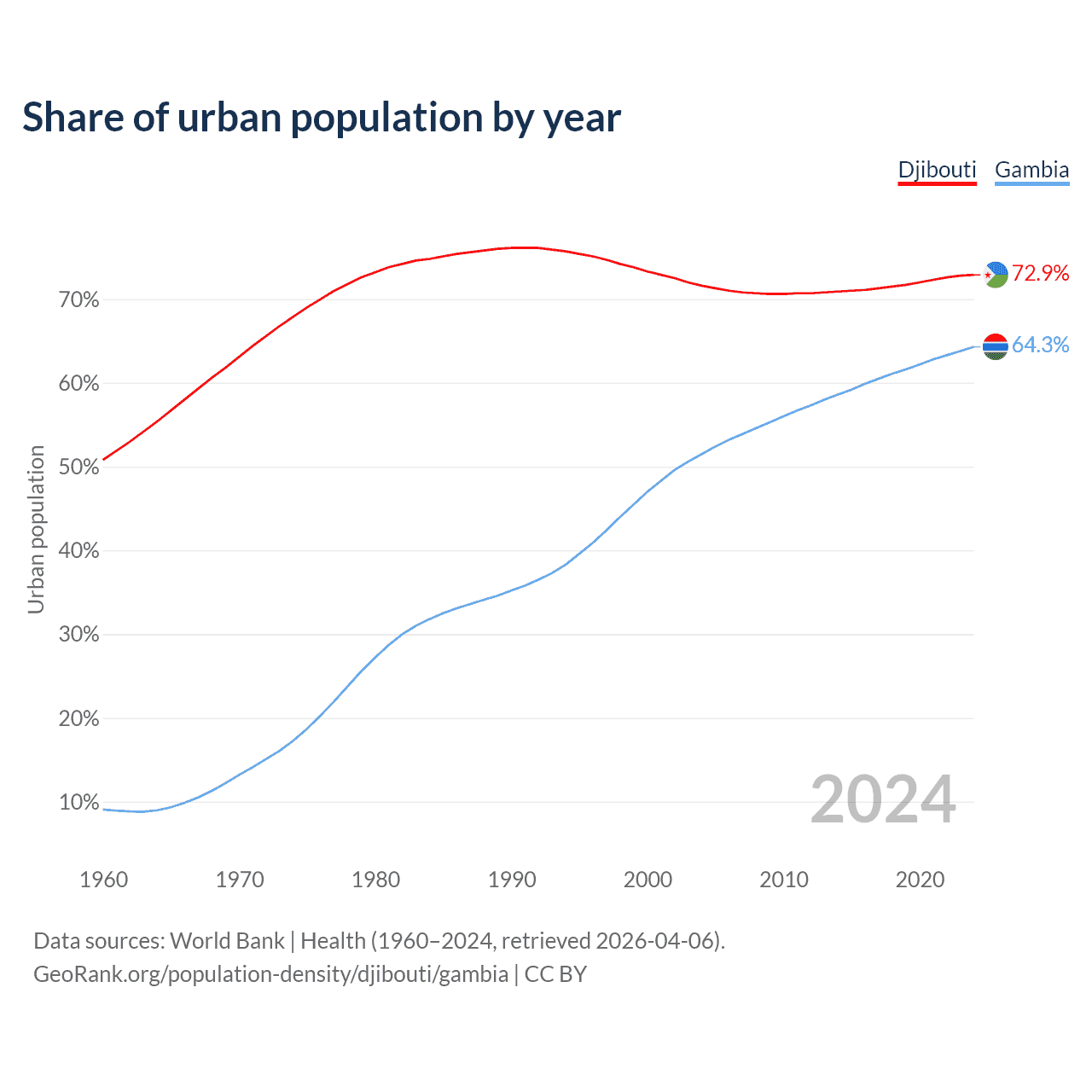 From 2004 to 2024, the share of urban population changed from 71.6% to 72.9% in Djibouti and from 51.5% to 64.3% in the Gambia.