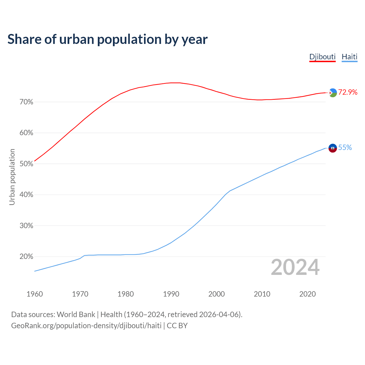 From 2004 to 2024, the share of urban population changed from 71.6% to 72.9% in Djibouti and from 41.9% to 55% in Haiti.