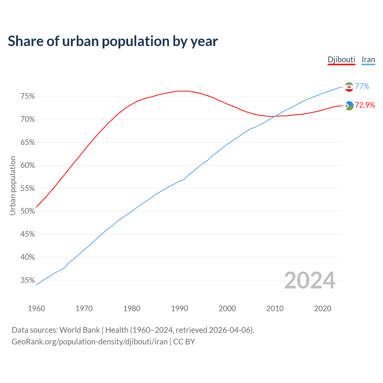 From 2004 to 2024, the share of urban population changed from 71.6% to 72.9% in Djibouti and from 67.3% to 77% in Iran.