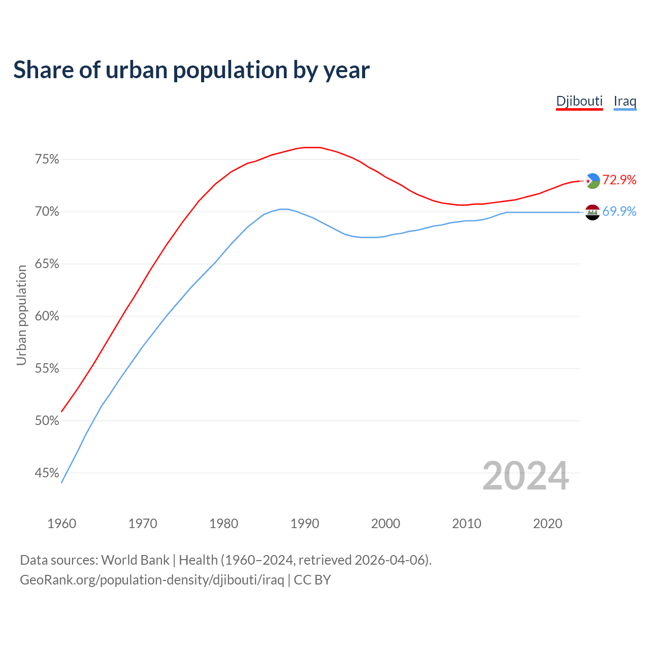 From 2004 to 2024, the share of urban population changed from 71.6% to 72.9% in Djibouti and from 68.2% to 69.9% in Iraq.