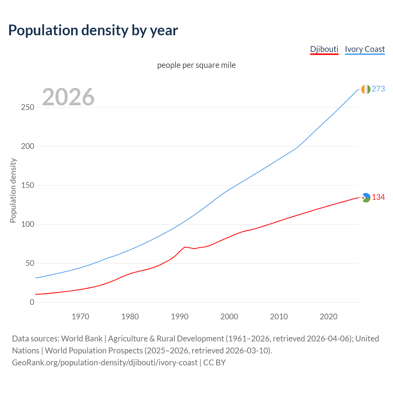 From 2006 to 2026, population density in Djibouti increased by 40.2%, compared to a 63.1% growth in Ivory Coast.