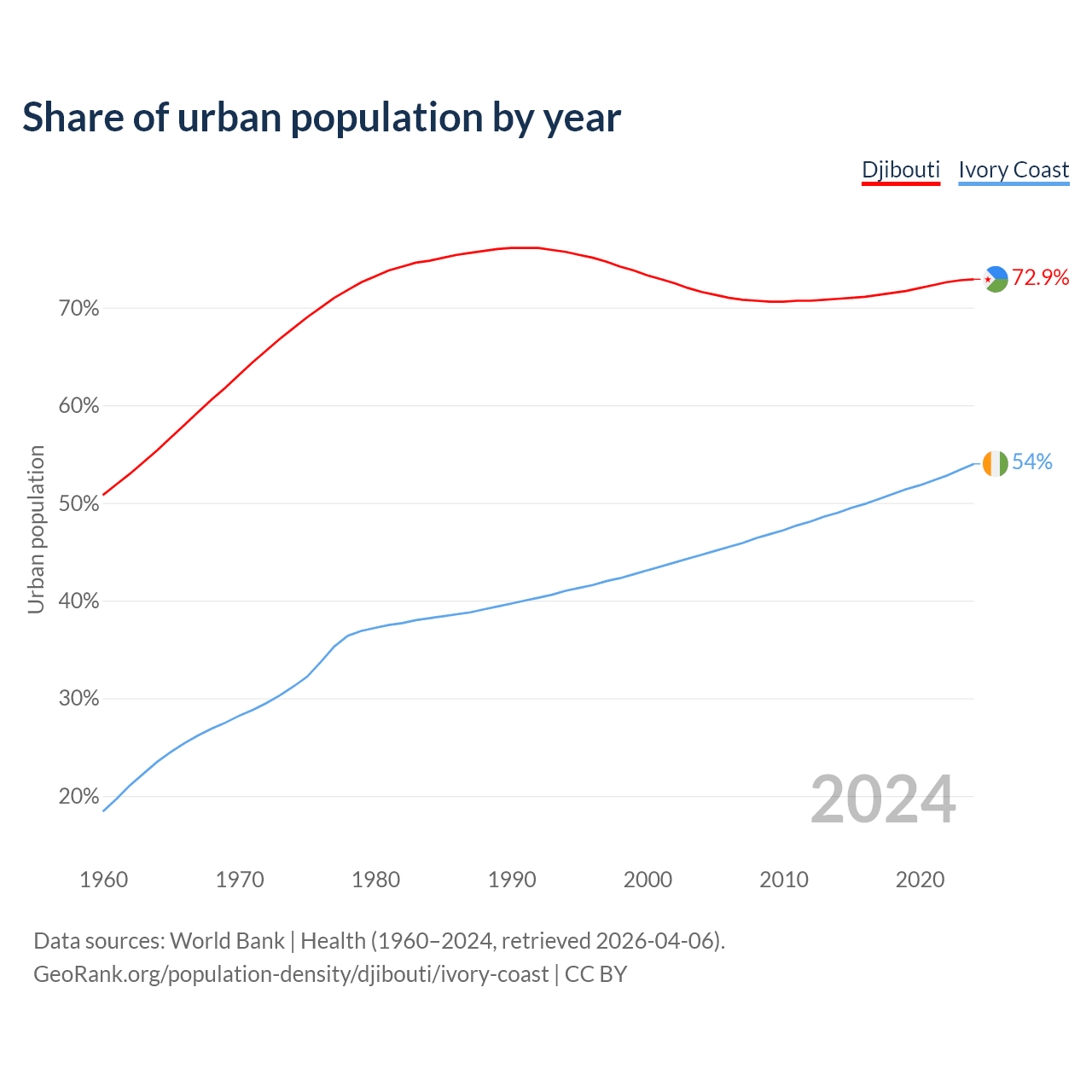 From 2004 to 2024, the share of urban population changed from 71.6% to 72.9% in Djibouti and from 44.7% to 54% in Ivory Coast.