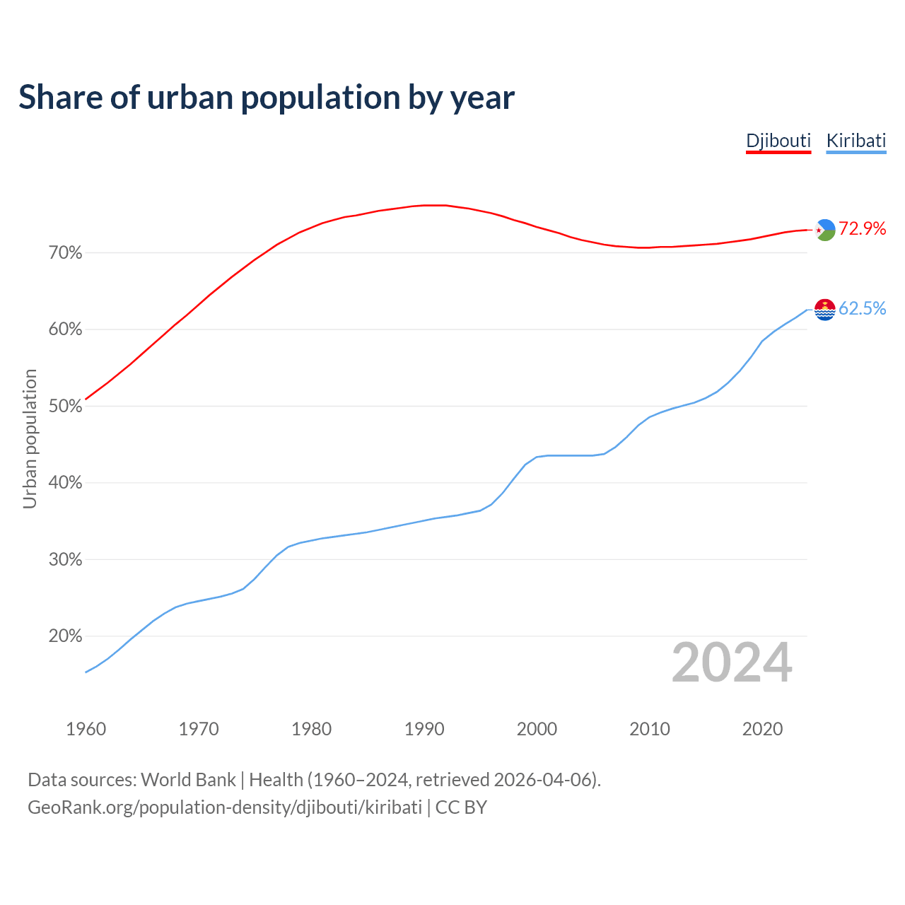 From 2004 to 2024, the share of urban population changed from 71.6% to 72.9% in Djibouti and from 43.5% to 62.5% in Kiribati.