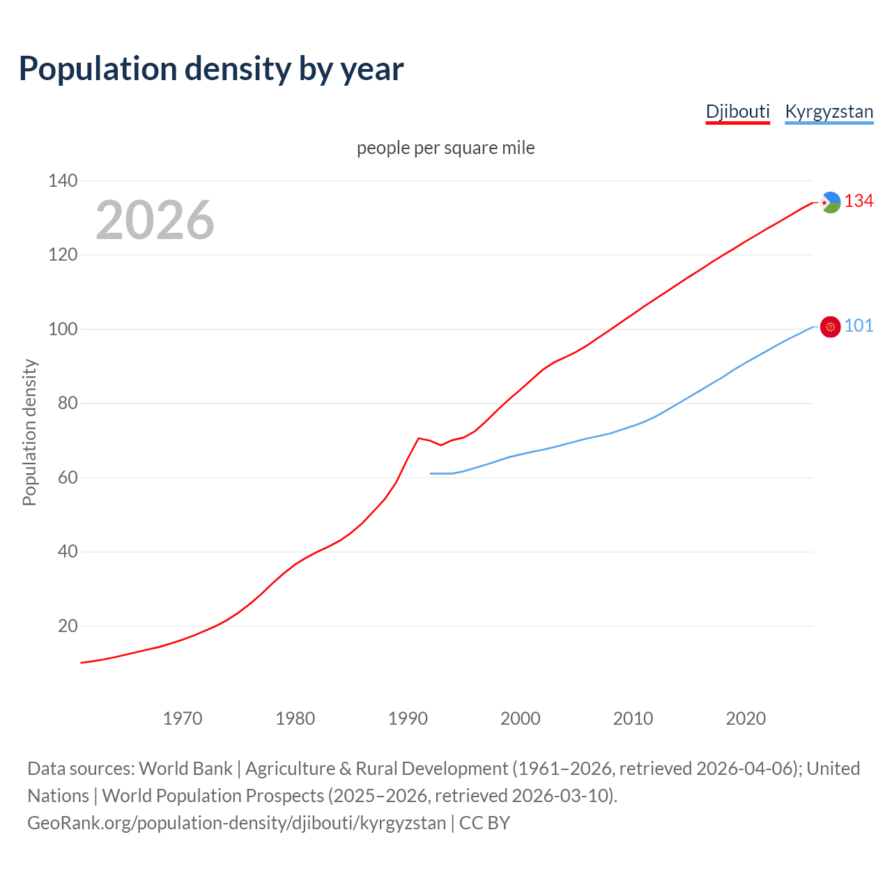 From 2006 to 2026, population density in Djibouti increased by 40.2%, compared to a 42.6% growth in Kyrgyzstan.