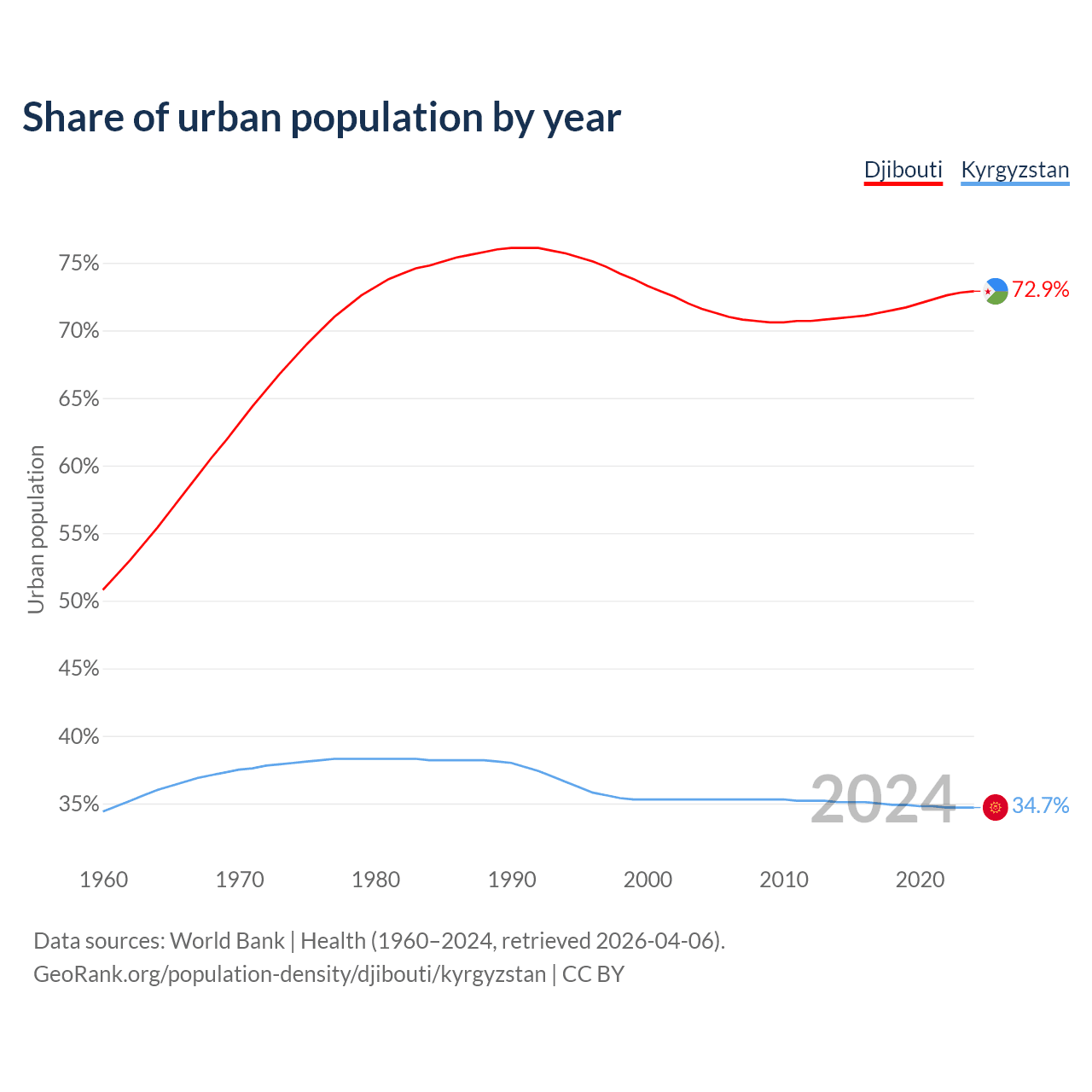 From 2004 to 2024, the share of urban population changed from 71.6% to 72.9% in Djibouti and from 35.3% to 34.7% in Kyrgyzstan.