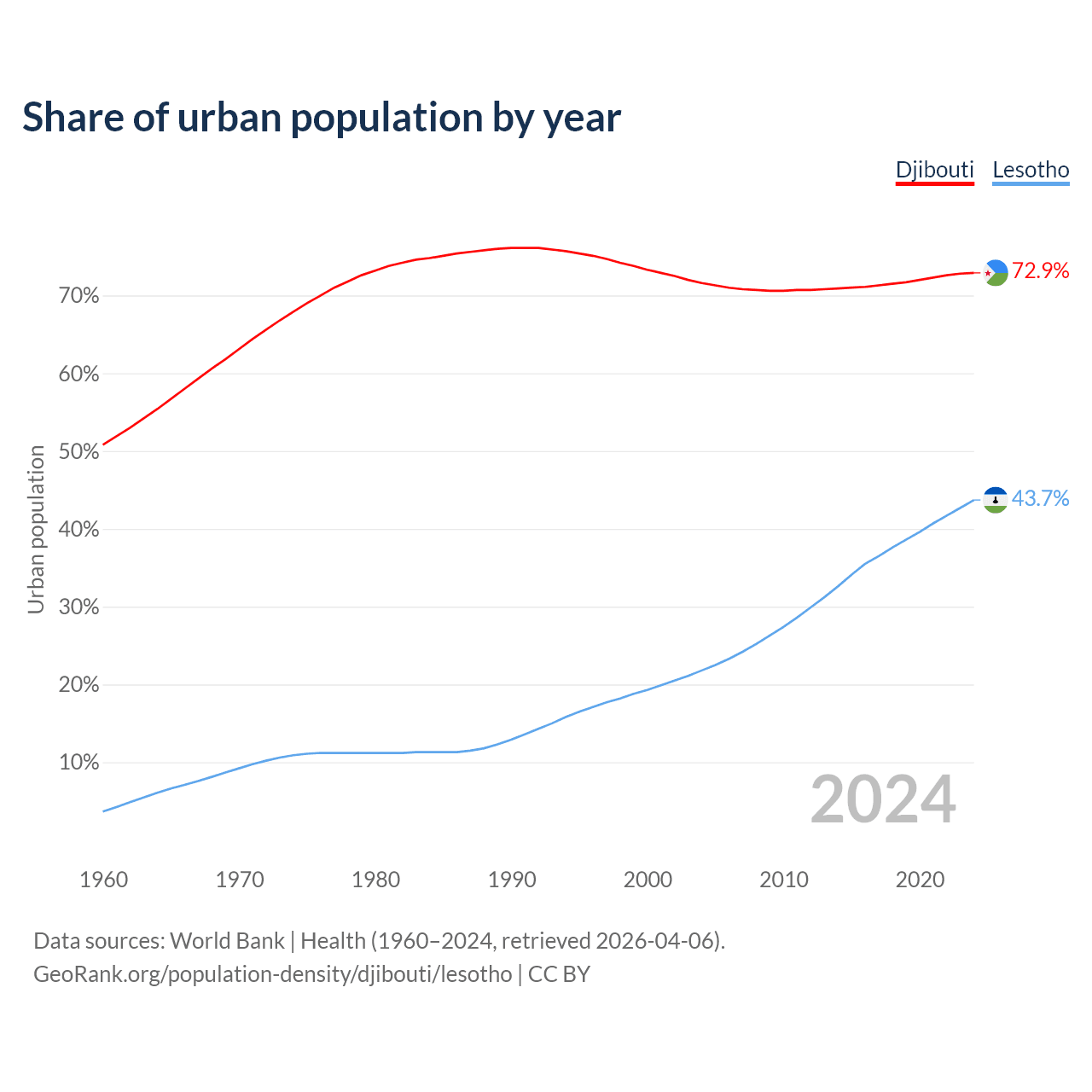 From 2004 to 2024, the share of urban population changed from 71.6% to 72.9% in Djibouti and from 21.8% to 43.7% in Lesotho.