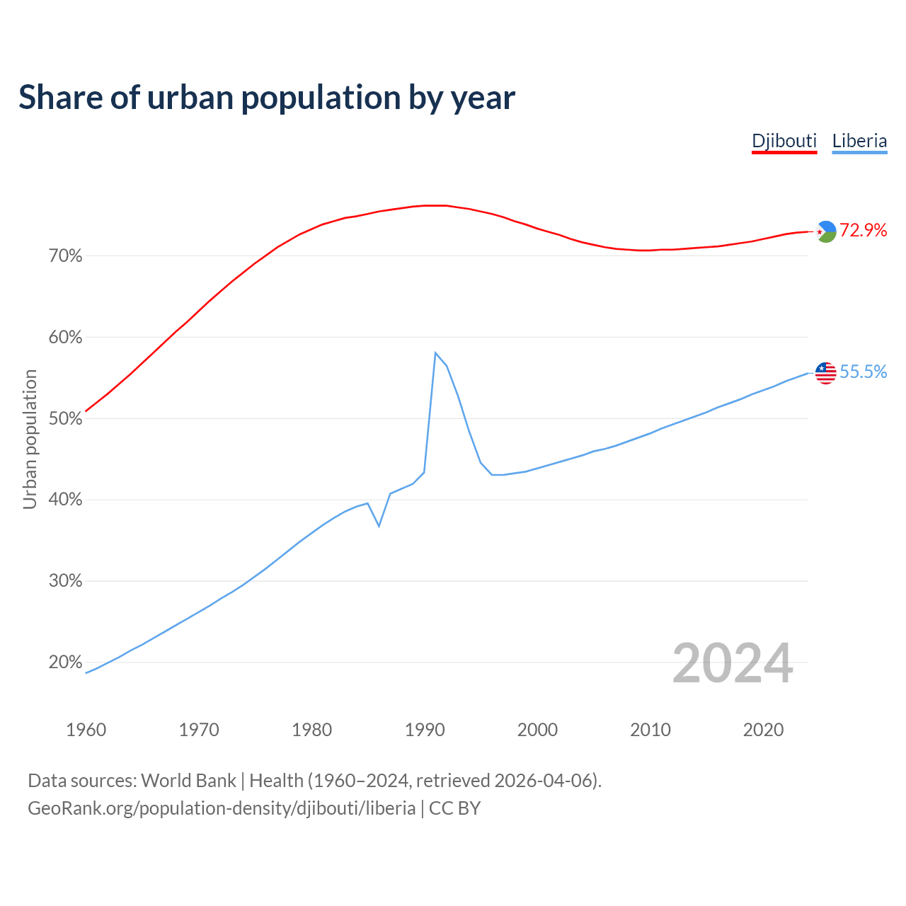 From 2004 to 2024, the share of urban population changed from 71.6% to 72.9% in Djibouti and from 45.4% to 55.5% in Liberia.
