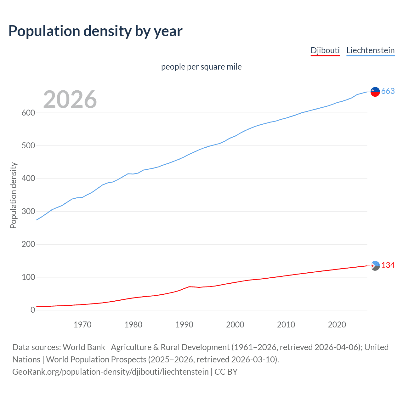 From 2006 to 2026, population density in Djibouti increased by 40.2%, compared to a 16.9% growth in Liechtenstein.