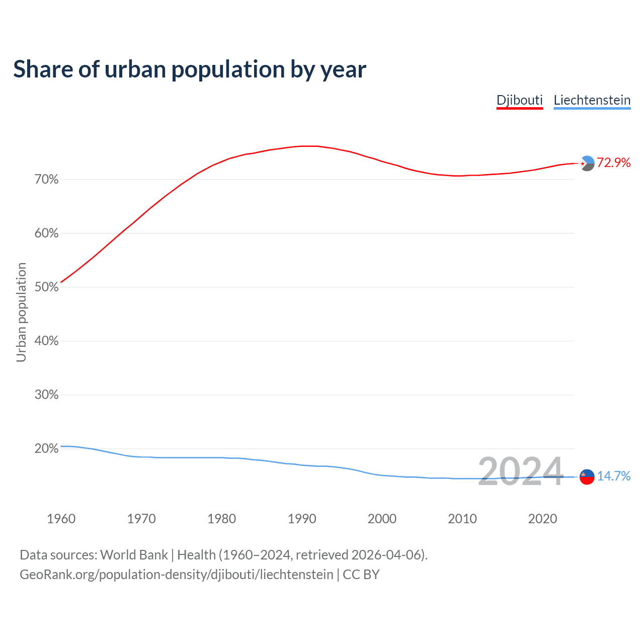 From 2004 to 2024, the share of urban population changed from 71.6% to 72.9% in Djibouti and from 14.7% to 14.7% in Liechtenstein.