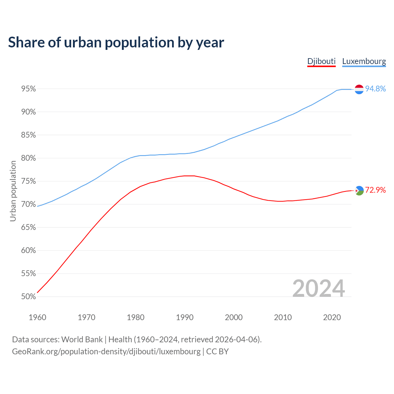 From 2004 to 2024, the share of urban population changed from 71.6% to 72.9% in Djibouti and from 86% to 94.8% in Luxembourg.