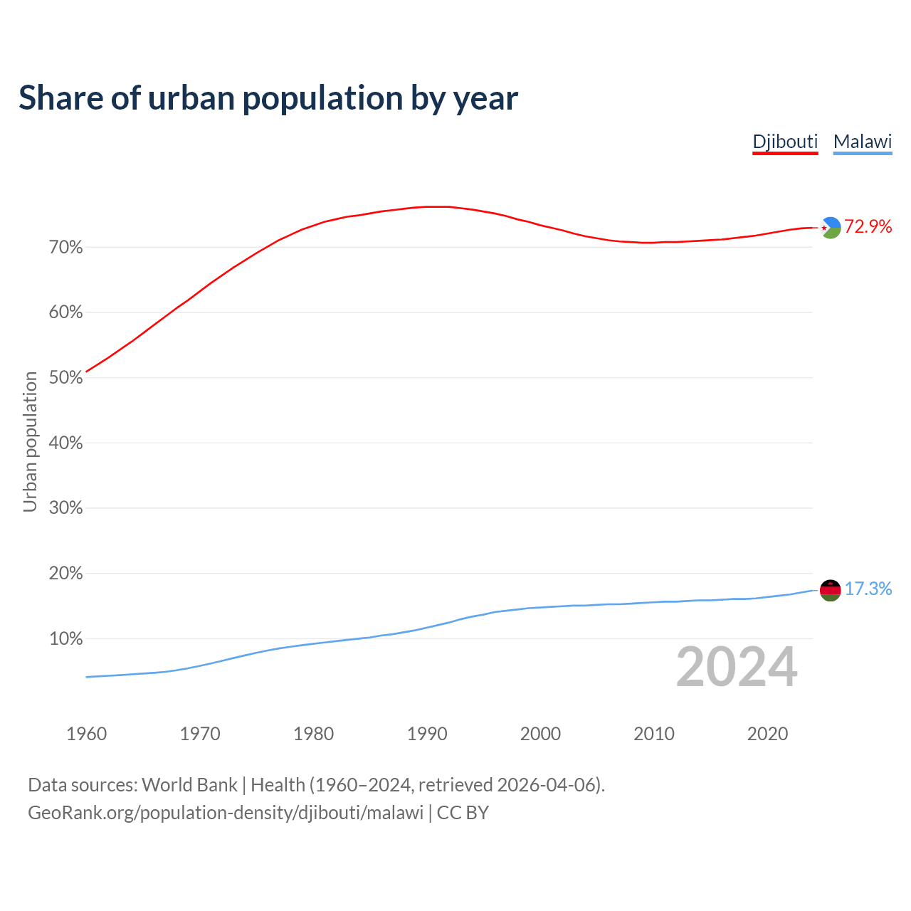 From 2004 to 2024, the share of urban population changed from 71.6% to 72.9% in Djibouti and from 15% to 17.3% in Malawi.