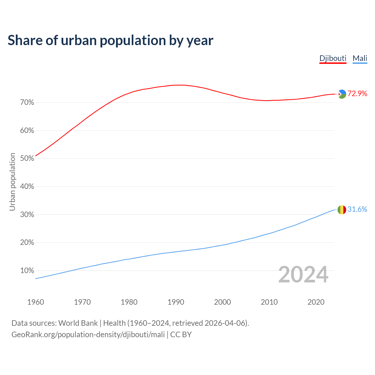 From 2004 to 2024, the share of urban population changed from 71.6% to 72.9% in Djibouti and from 20.5% to 31.6% in Mali.