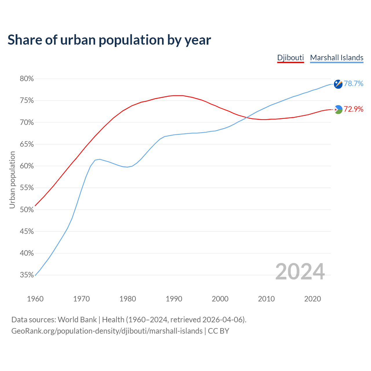 From 2004 to 2024, the share of urban population changed from 71.6% to 72.9% in Djibouti and from 70.1% to 78.7% in the Marshall Islands.