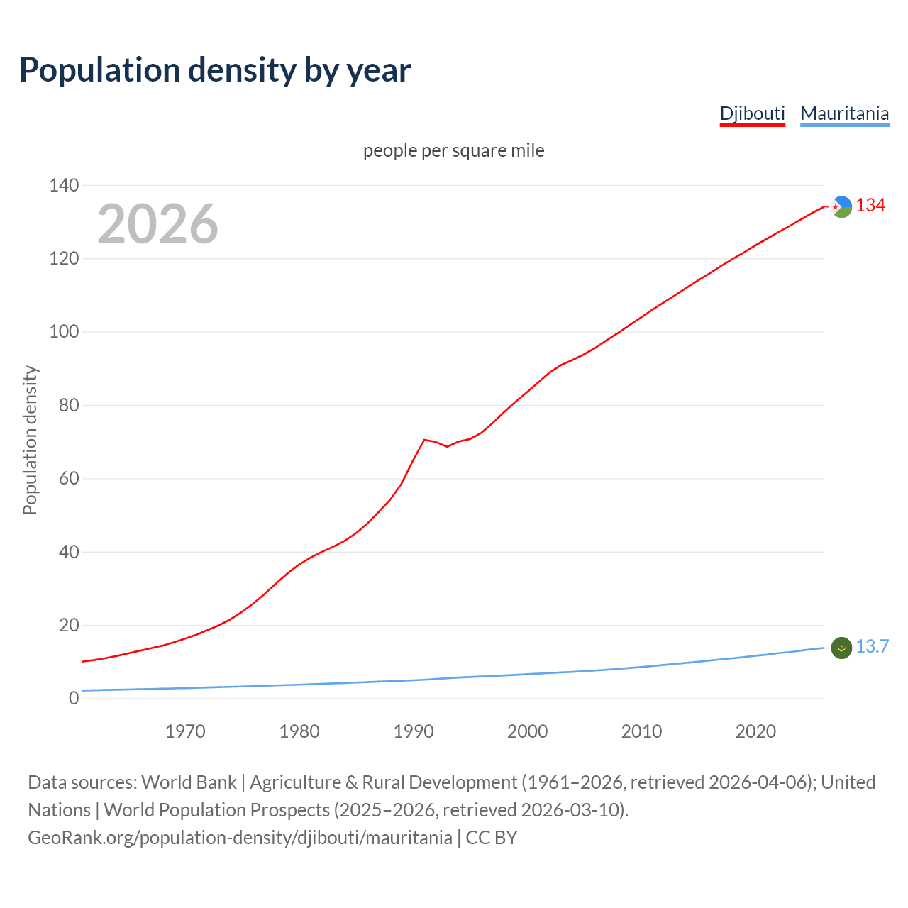From 2006 to 2026, population density in Djibouti increased by 40.2%, compared to a 81.3% growth in Mauritania.