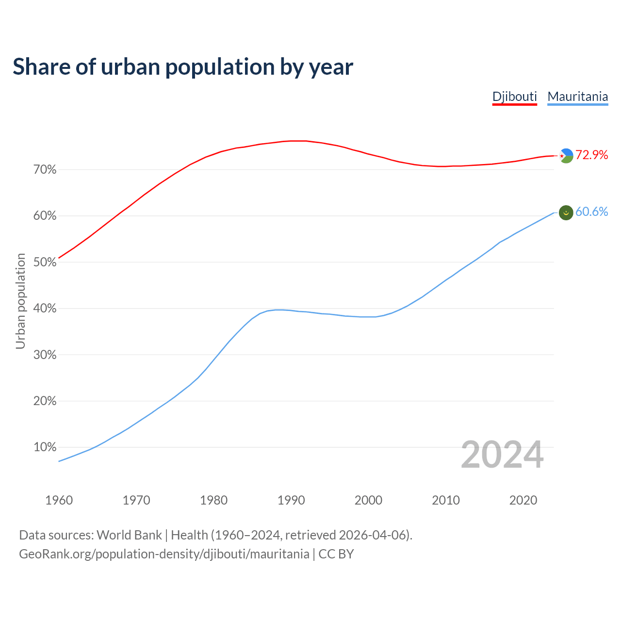 From 2004 to 2024, the share of urban population changed from 71.6% to 72.9% in Djibouti and from 39.6% to 60.6% in Mauritania.