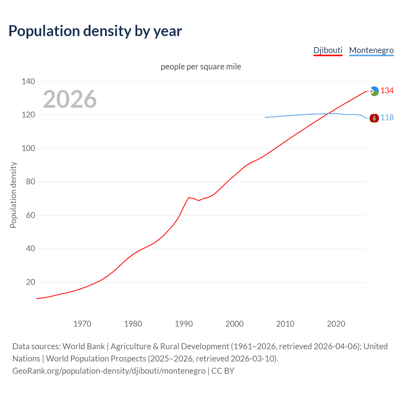From 2006 to 2026, population density in Djibouti increased by 40.2%, compared to a 0.44% decline in Montenegro.