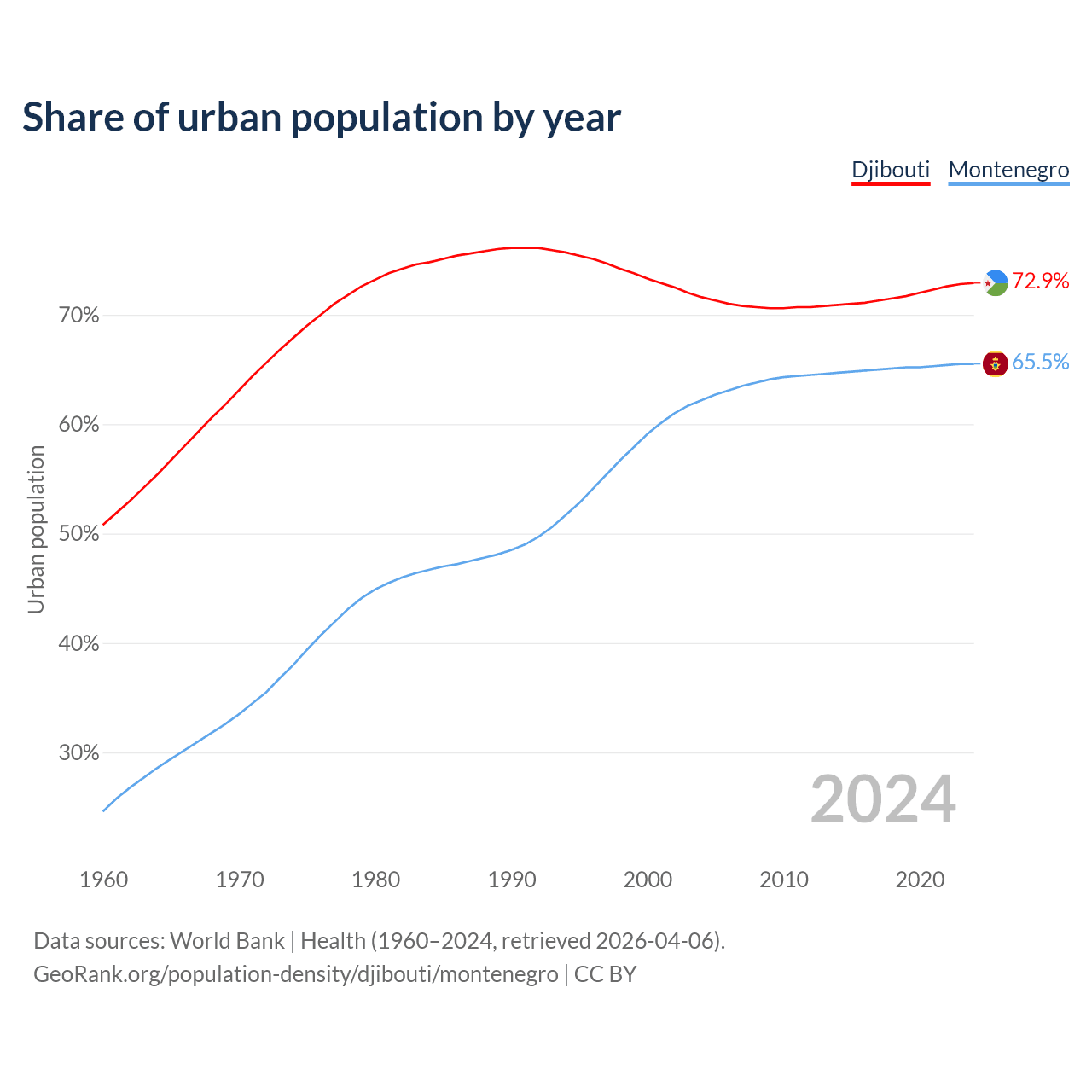 From 2004 to 2024, the share of urban population changed from 71.6% to 72.9% in Djibouti and from 62.2% to 65.5% in Montenegro.