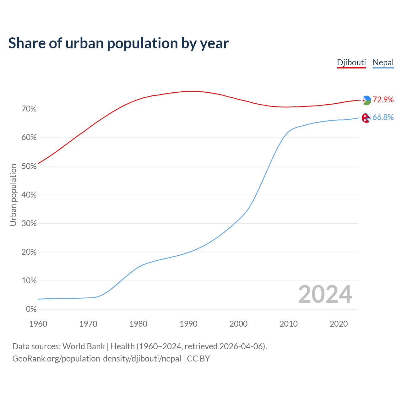 From 2004 to 2024, the share of urban population changed from 71.6% to 72.9% in Djibouti and from 41.6% to 66.8% in Nepal.